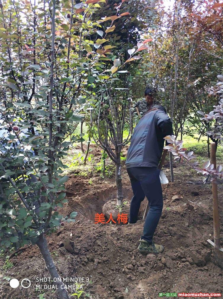 美人梅(学名:Prunus × blireana cv. Meiren):落叶小乔木或灌木,法国引进。由重瓣粉型梅花与红叶李杂交而成。落叶小乔木。叶片卵圆形,长5~9厘米,叶柄长1-1.5厘米,叶缘有细锯齿,叶被生有短柔毛,花色浅紫,重瓣花,先叶开放,萼筒宽钟状,萼片5枚,近圆形至扁圆,花瓣15-17枚,小瓣5-6梅,花梗1.5厘米,雄蕊多数,自然花期自3月...朵花开以后,逐次自上而下陆续开放至4月中旬。紫红色。花粉红色,繁密,先花后叶。花期春季。喜阳光充足、通风良好、开阔的环境。要求土层深厚、排水良好、富含有机质的土壤。嫁接、压条、扦插繁殖。优良的园林观赏、环境绿化的树种。同时基地还有各种绿化苗木及各种果树苗,以诚信经营实在做事赢得了客户的好评,欢迎新老客户前来实地考察洽谈业务。