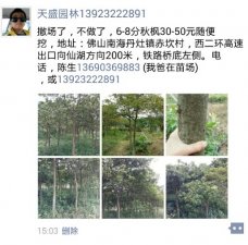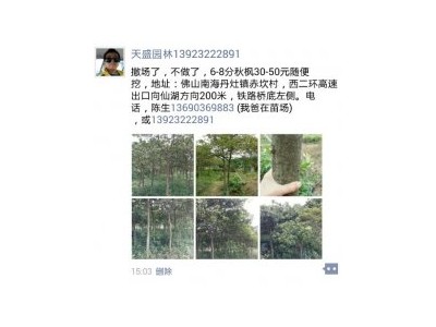 详细信息 撤场了,不做了6-8分秋枫地苗30-50元随便挖,卖柴的价钱,地址:佛山南海丹灶镇赤坎村,西二环高速出口向仙湖方向200米,铁路桥底 左侧,电话13690369883 陈生(我爸) 或13923222891
