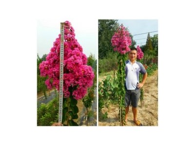 园林用途:速生鲜红花紫薇生长超快,主杆通直粗壮,发枝多而直立性强,易于修型,定杆后侧枝异常发达苍劲,树冠密实丰满。花朵巨大,形状特别,开花量大,夏秋季节花团锦簇、鲜艳亮丽。既适合作行道树,又适合作庭院、公园孤植及绿化工程点缀用的风景树,是不可多得的多用途园林景观精品,发展前景巨大,相信未来很难有比其更好的紫薇品种能将本品种取代。(图为一年生长势)