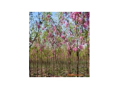 香花槐入世黄金树.香花槐原产西班牙皇家园林,我国近年从韩国引入。香花槐属蝶形花,豆科槐类落叶乔木,株高10-15米,叶片油绿、花为粉红或紫红色,浓香。在东北寒冷地区每年五月和七月两次开花,又得名“五七香花槐”。在长城以南地区多季连续开花,在黄河以南盛花期更长,因此又叫多季香花树。成树每次开花量为200-300朵,花朵大而串长,呈下垂状,约8-12厘米。(近似紫藤花形,比紫藤色泽艳丽)浓郁芳香典雅,花形如蝶飞舞,惟妙惟肖,妩媚动人,美不胜收,独具特色,颇赋园林贵族风采。是花苑中的佼佼者,绿化、美化的明星树种。