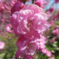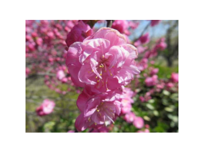 属于观赏桃花类的半重瓣及重瓣品种,统称为碧桃。华东地区碧桃花期是3月~4月,花朵丰腴,色彩鲜艳丰富,花型多。常见的品种有红花绿叶碧桃、红花红叶碧桃,白红双色洒金碧桃等多个变种。碧桃具有很高的观赏价值,在小区、公园、街道随处可见的美丽植物。
