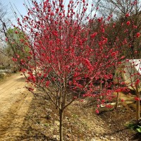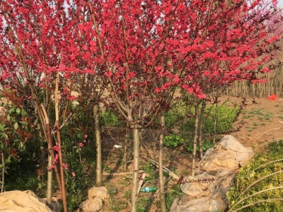 【紫叶碧桃园林应用】紫叶碧桃三月份先花后叶,烂漫芳菲,妩媚可爱,是优良的观花树种。紫叶碧桃在山坡、水畔、石旁、墙际、庭院、草坪边俱宜栽植,也可盆栽、切花或作桩景。