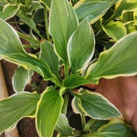 【金边玉簪种植管理】春季发芽前或秋季叶片枯黄后,将其挖出,去掉根际的土壤,根据要求用刀将地下茎切开,...每丛有2-3块地下茎和尽量多的保留根系,栽在盆中。这样利于成活,不影响翌年开花。